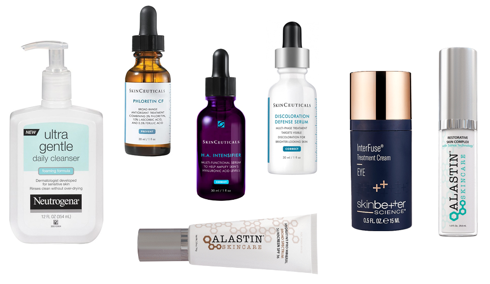 После повторного очищения средством Neutrogena из утренней рутины, эксперт наносит сыворотку против пигментации Discoloring Defense, SkinCeuticals. Затем средства с пептидами, замедляющие старение: крем для кожи вокруг глаз Science InterFuse Treatment Cream Eye, Skinbetter и средство для лица Restorative Skin Complex, Alastin.