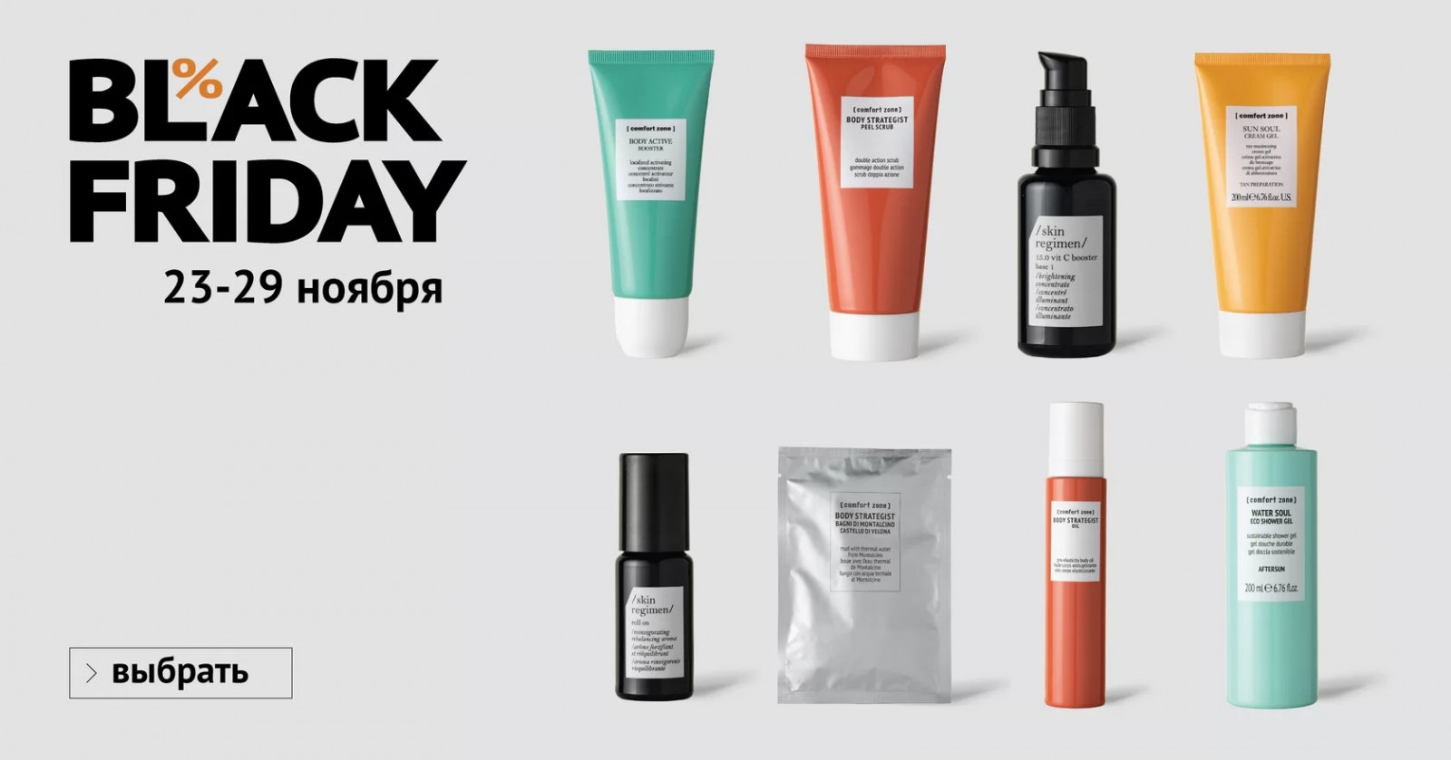 В официальном интернет-магазине [ Сomfort zone ] Россия Черная пятница продлится до 29 ноября. Скидки на уходы достигают 45%, также по специальным ценам можно купить travel- и подарочные наборы. Полный каталог средств смотрите здесь.