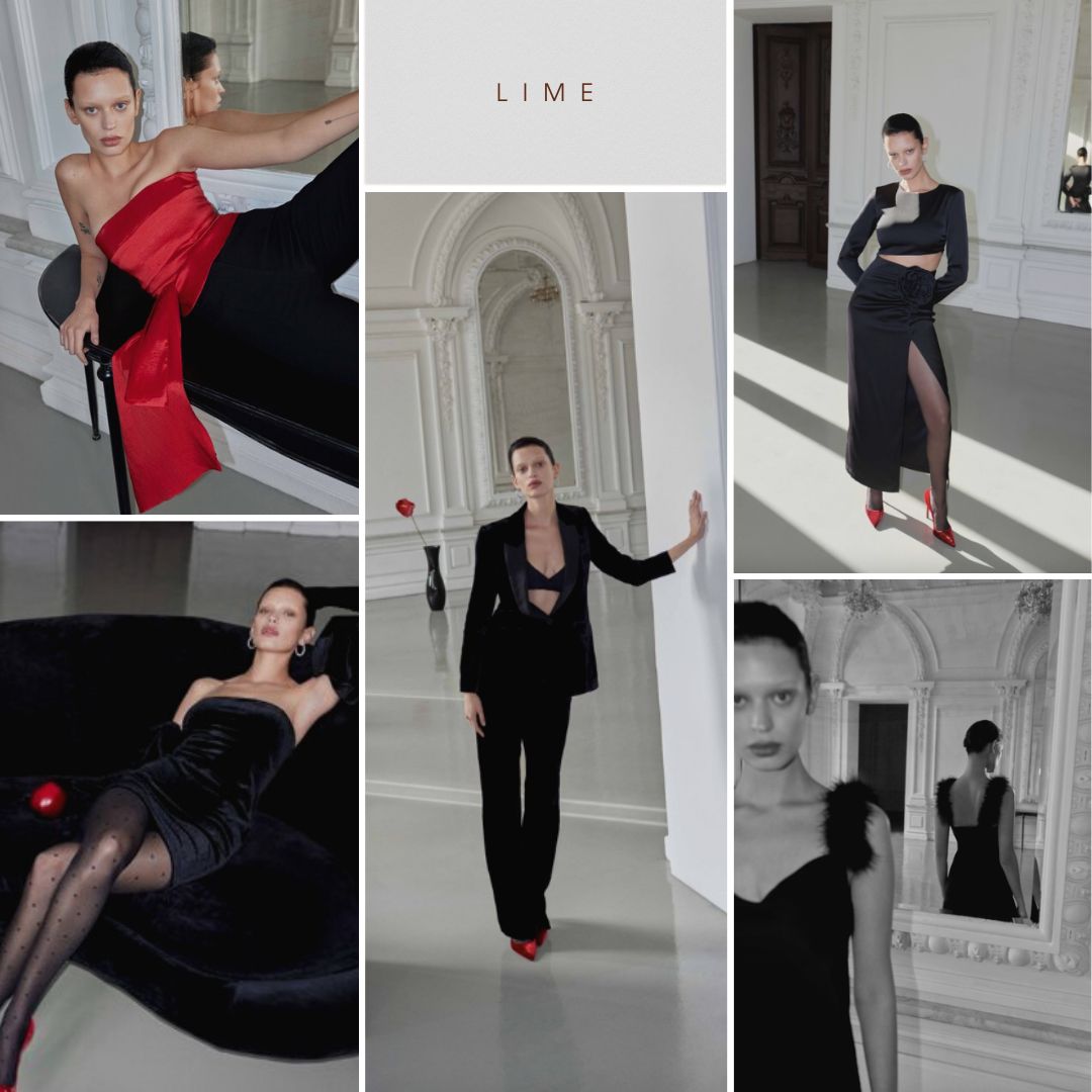Бренд Lime представляет современный взгляд на black tie, основанный на сочетании черного и красного. Материалами коллекции стали бархат, тафта и сатин. И, конечно, не обошлось без перьев, бантов и декоративных цветов. Важная деталь коллекции – длинные черные бархатные перчатки, которые можно носить с бархатным платьем без бретелей или с боди.
