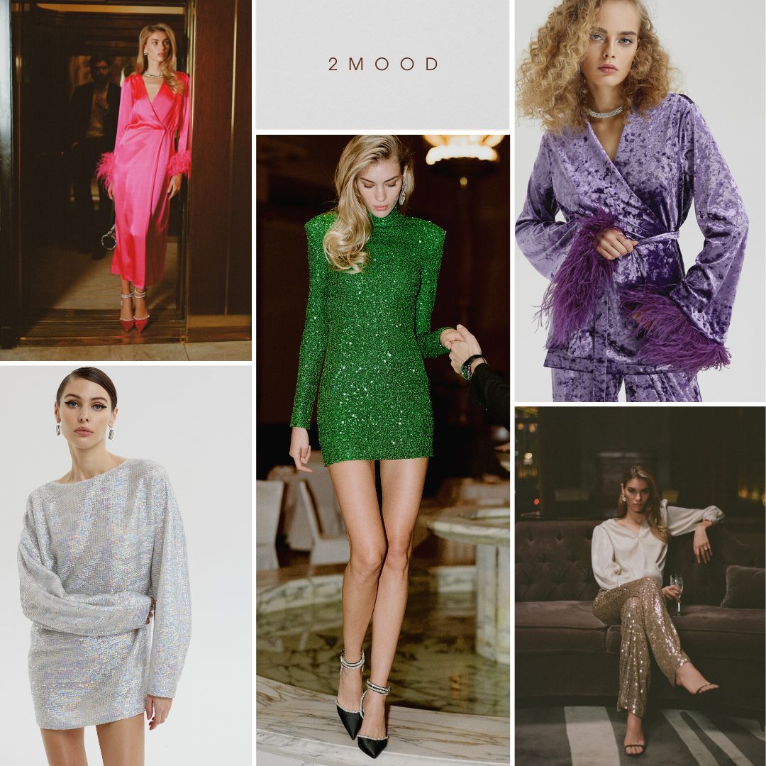 2 Mood предлагает встречать Новый год в сияние нулевых. Яркие цвета, перья, стразы – все это можно найти в новой коллекции бренда. Главные хиты — атласное платье макси с перьями, закрытое мини с блестками и золотые боюки-палаццо, которые можно сочетать с однотонной блузой или лонгсливом. И важно, что к наряду можно сразу подобрать и обувь с аксессуарами: в линейке представлены сверкающие туфли и сумки, а также массивный чокер с белоснежной розой.