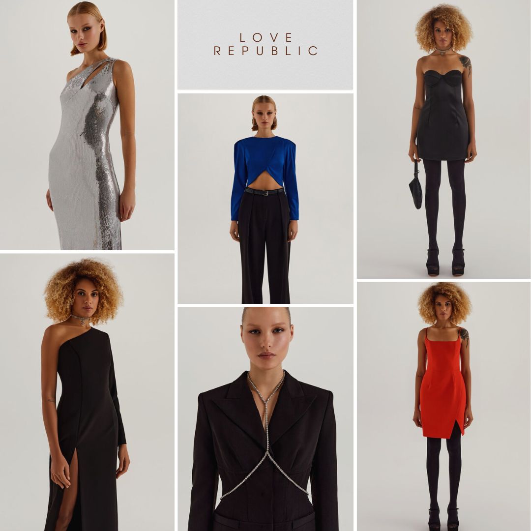 У Love Republic можно найти как классические модели вечерних платьев, так и дерзкие мини с пайетками. Главные мастхэвы — двубортный смокинг с атласными лацканами, платья-футляры, комбимнезоны с открытыми плечами и цепочка для тела со стразами. Главные цвета — черный, красный, синий, серебряный и золотой. Многие модели потом можно носить в повседневной жизни весной!