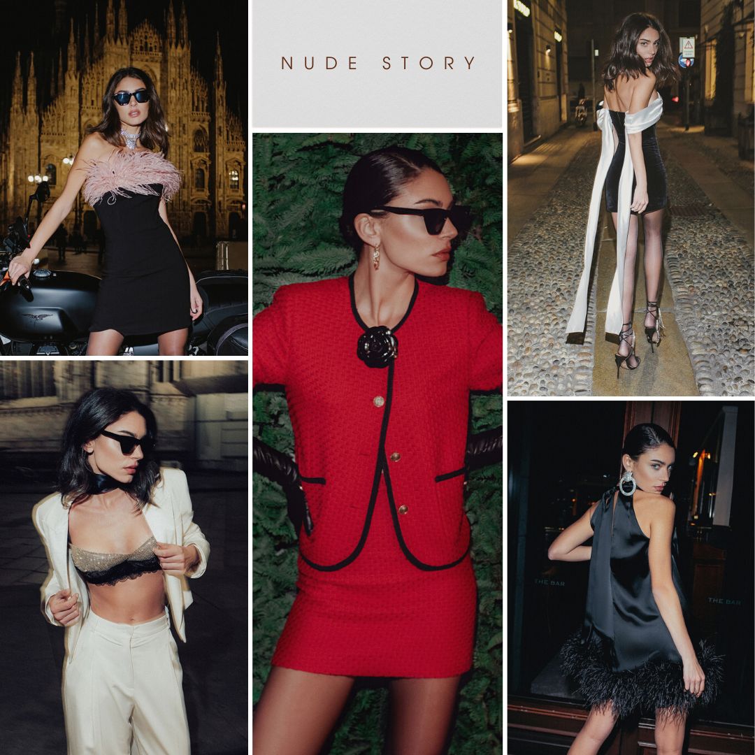 Nude Story представил коллекцию в духе классического шика миланского street-fashion. В линейку вошли вечерние платья с цветочным принтом, розовыми перьями, объемными бантами и тонкими цепочками. Также представлены классические брючные костюмы с укороченными жакетами, твидовый жакет и юбка в красном цвете, шелковые блузы на завязках, юбка и брюки из экокожи, кардиган с перьями и два корсета. Потом любой из этих образов можно смело внедрять в 2023-ый на фэшн-меропроятие или свидание.