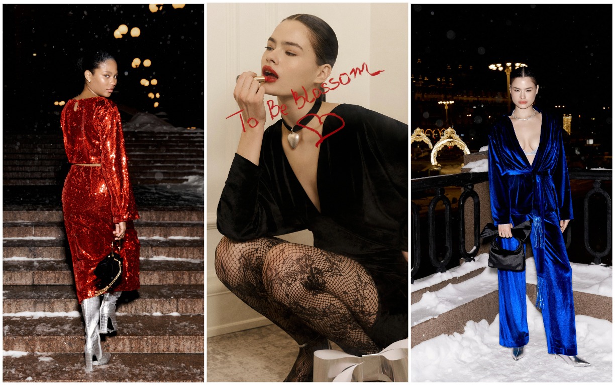 To Be Blossom продолжает путь по расширению ассортимента, в новогоднюю капсулу вошли аксессуары и обувь: классические лодочки и блестящие босоножки, а также кисет из велюра и акцентная сумка, покрытая стразами. Добавить изюминку наряду можно с помощью украшений: боа, фактурных серег и чокеров с цветками.