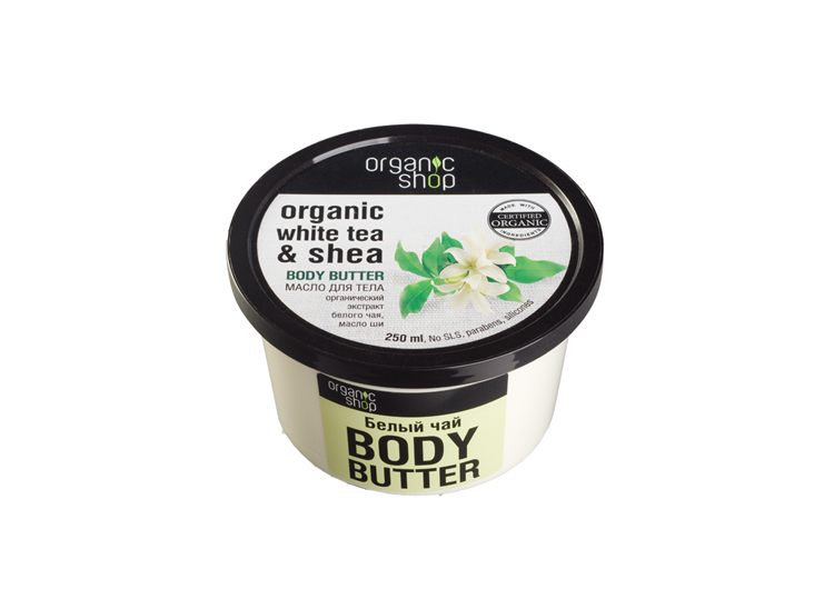 Основа средства – органическое масло ши. Экстракт белого чая дает сильный аромат, который надолго остается на коже. В банке масло выглядит твердым, но во время нанесения начинает немного таять (от соприкосновения с кожей), и через пару секунд напоминает густой крем.